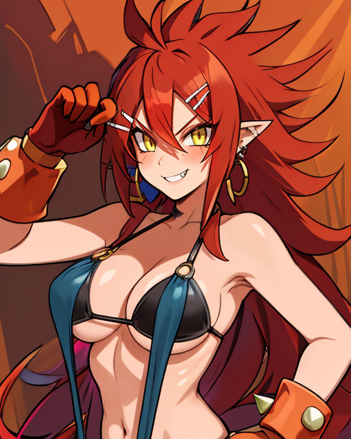 브레이서, 언더부, O링, 귀걸이, 머리 장식, 파랑 수영복 아래 검정 빅니니, 주황색 채프스, 흰색 헤어클립, 주황색 손가락 없는 장갑,