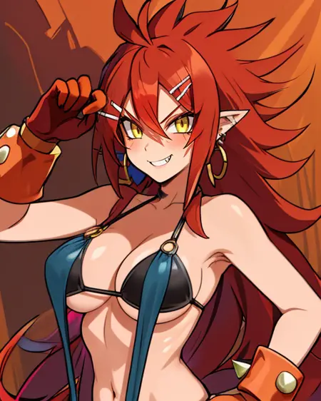 bracer, underboob , o-ring ,earrings, hair ornament ,black bikini under a blue swimsuit, orange chaps, white hairclip, orange fingerless gloves,
