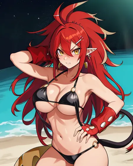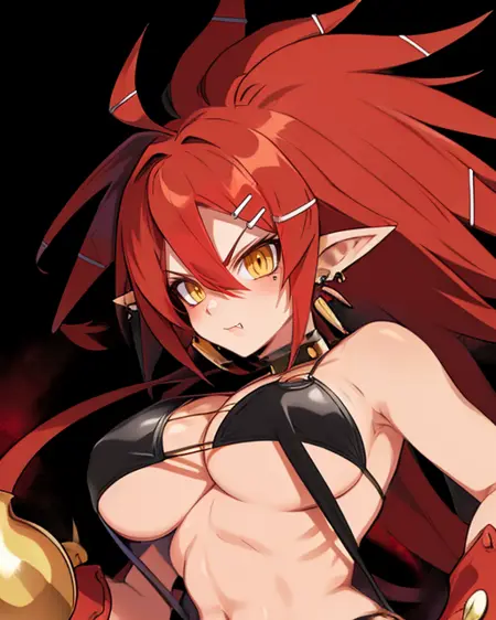 BMaster, red hair, spiked hair, yellow eyes, pointy ears, tail on buttocks with yellow tip,