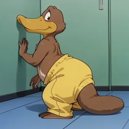 FlapbbILv2, semi-anthro, male, Platypus, brown fur, duck-billed, webbed feet, webbed fingers,