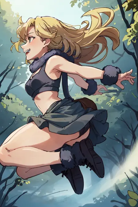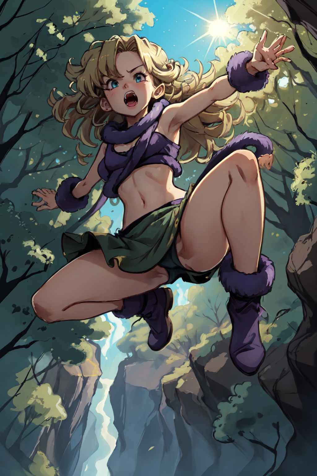 long blonde curly hair, purple fur scarf, purple skirt