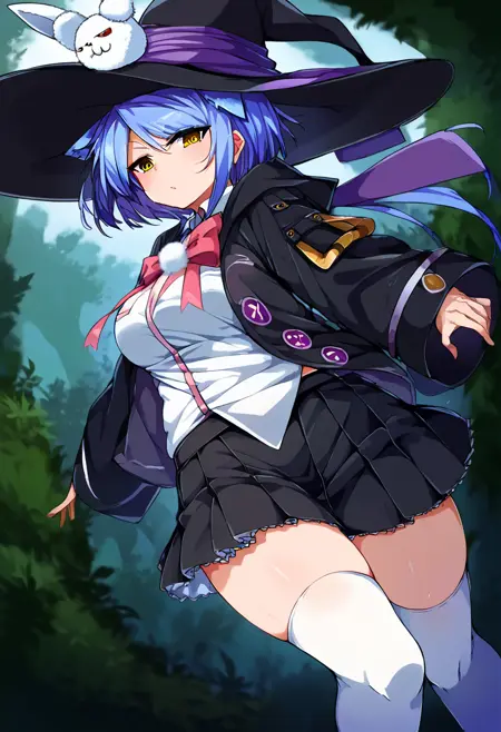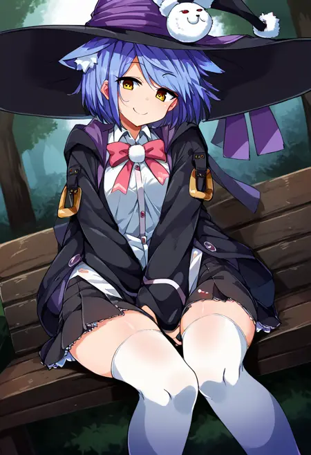 mahoushi_teria,animal ears,cat ears,animal ear fluff, yellow eyes,blue hair,purple hair,short hair, long hair,white thighhighs,white shirt, ribbon, jacket,hood,skirt,witch,witch hat,
