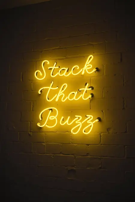 " n30n_51gn,一块黄色霓虹灯牌,上面写着 "Stack That Buzz" "