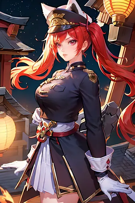 提示词: Capheny_Maple_Front, 1girl, solo, hat, black headwear, animal ears, twintails, red hair, looking at viewer, red eyes, lips, closed mouth, uniform, military, military uniform, breasts, long sleeves, gloves, white gloves, skirt, white skirt, mask, fox mask, shoes, socks, white socks, black footwear, holding, weapon, gun, lantern