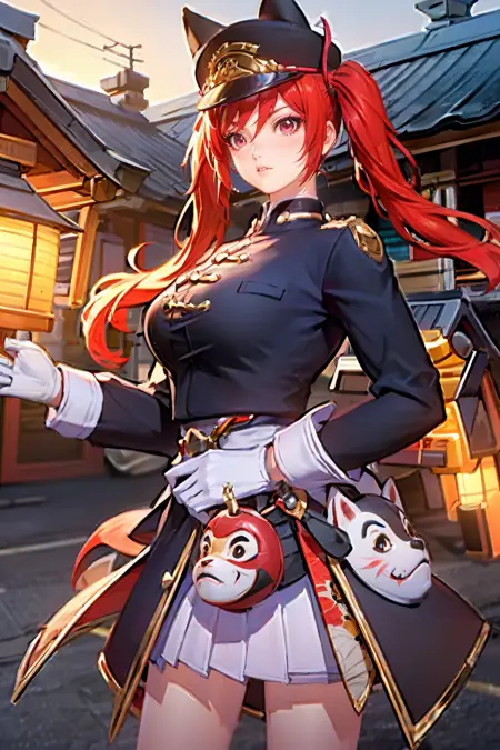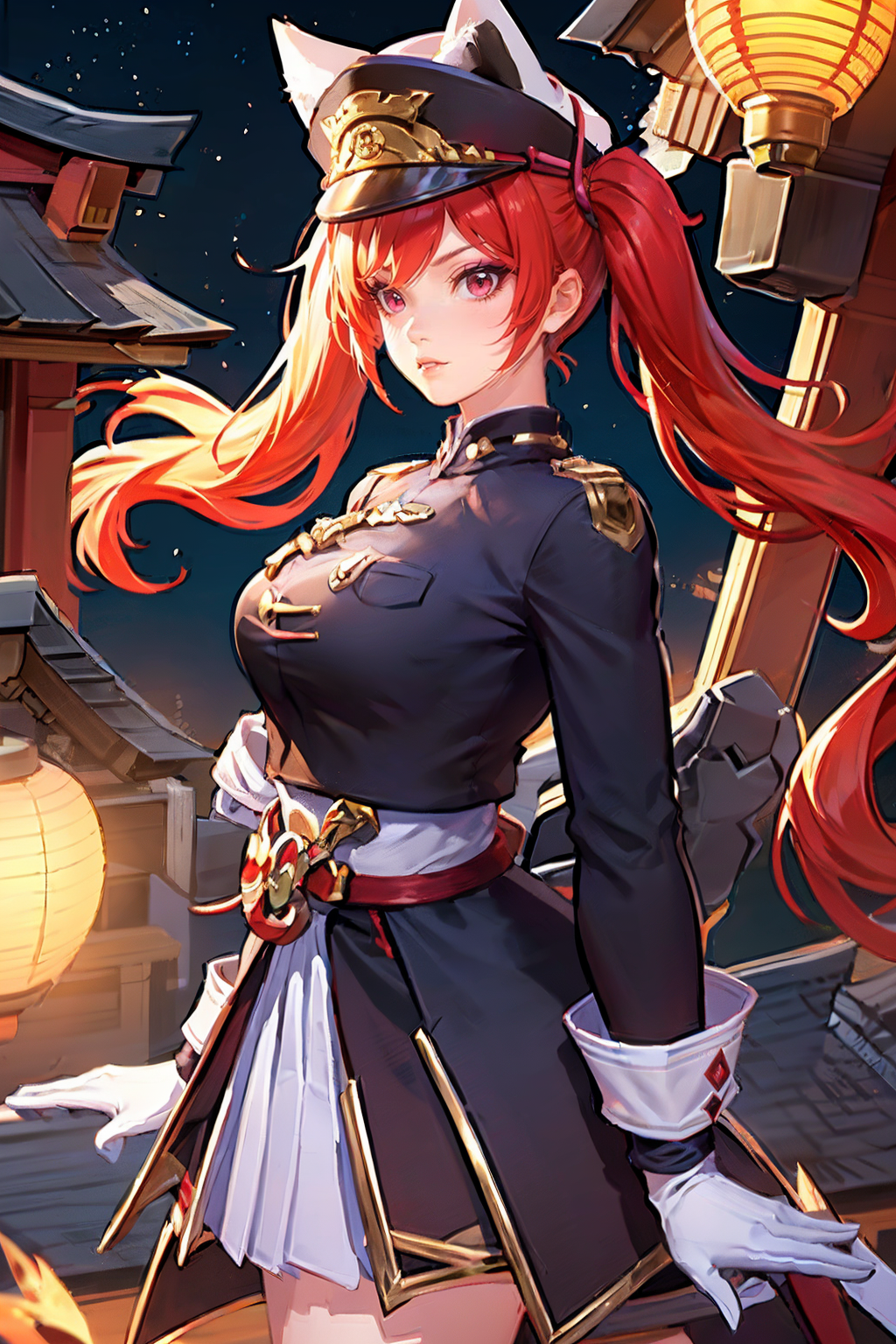 프롬프트: Capheny_Maple_Front, 1girl, solo, hat, black headwear, animal ears, twintails, red hair, looking at viewer, red eyes, lips, closed mouth, uniform, military, military uniform, breasts, long sleeves, gloves, white gloves, skirt, white skirt, mask, fox mask, shoes, socks, white socks, black footwear, holding, weapon, gun, lantern