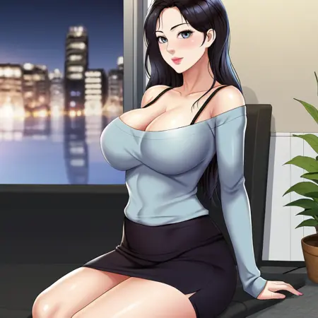 브라 스트랩 및 치마 포함 트리거: ChaeRin, 1girl, large breasts, black hair, long hair, cleavage, black skirt, blue eyes, off shoulder, bare shoulders, bra strap, collarbone, lips, underwear, shirt, pencil skirt, black bra, sweater