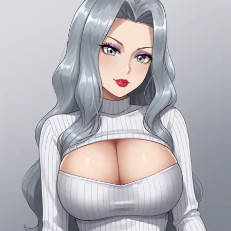 触发词:KarenPokemon, 1girl, solo, long hair, white pants, crop top, large breasts, navel, midriff, grey eyes, yellow shirt, grey hair, eyelashes, cleavage, bare shoulders, cowboy shot