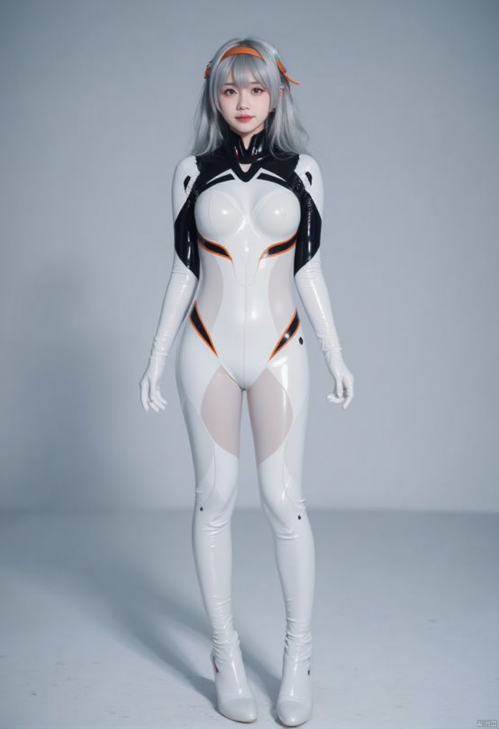Recommended Words: Firefly Cosplay, a female model stands in a stark white bodysuit, adorned with a black collar and a black belt around her waist. The model's head is The model's head is adorned with an orange bow, adding a pop of color to the scene. The backdrop is a stark grey, creating a stark contrast to the model's white outfit