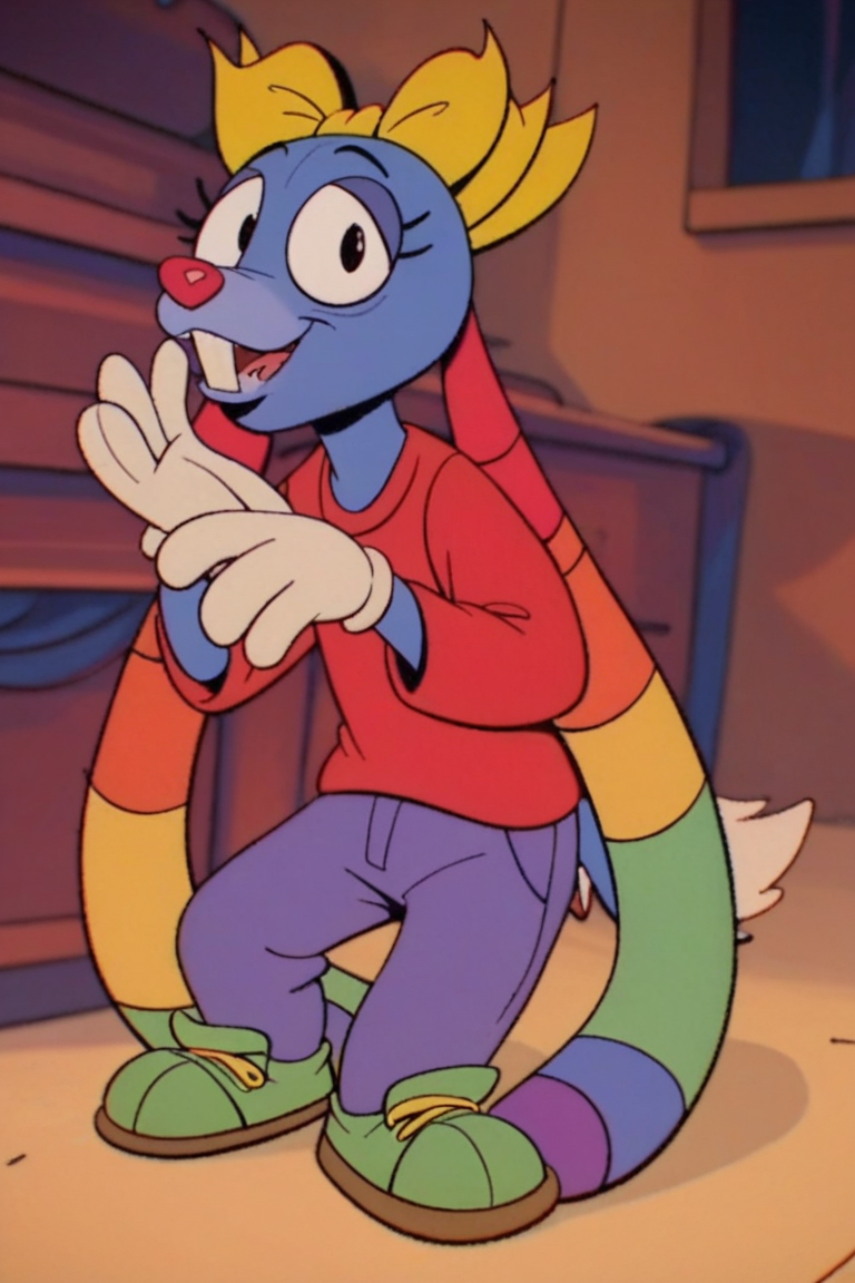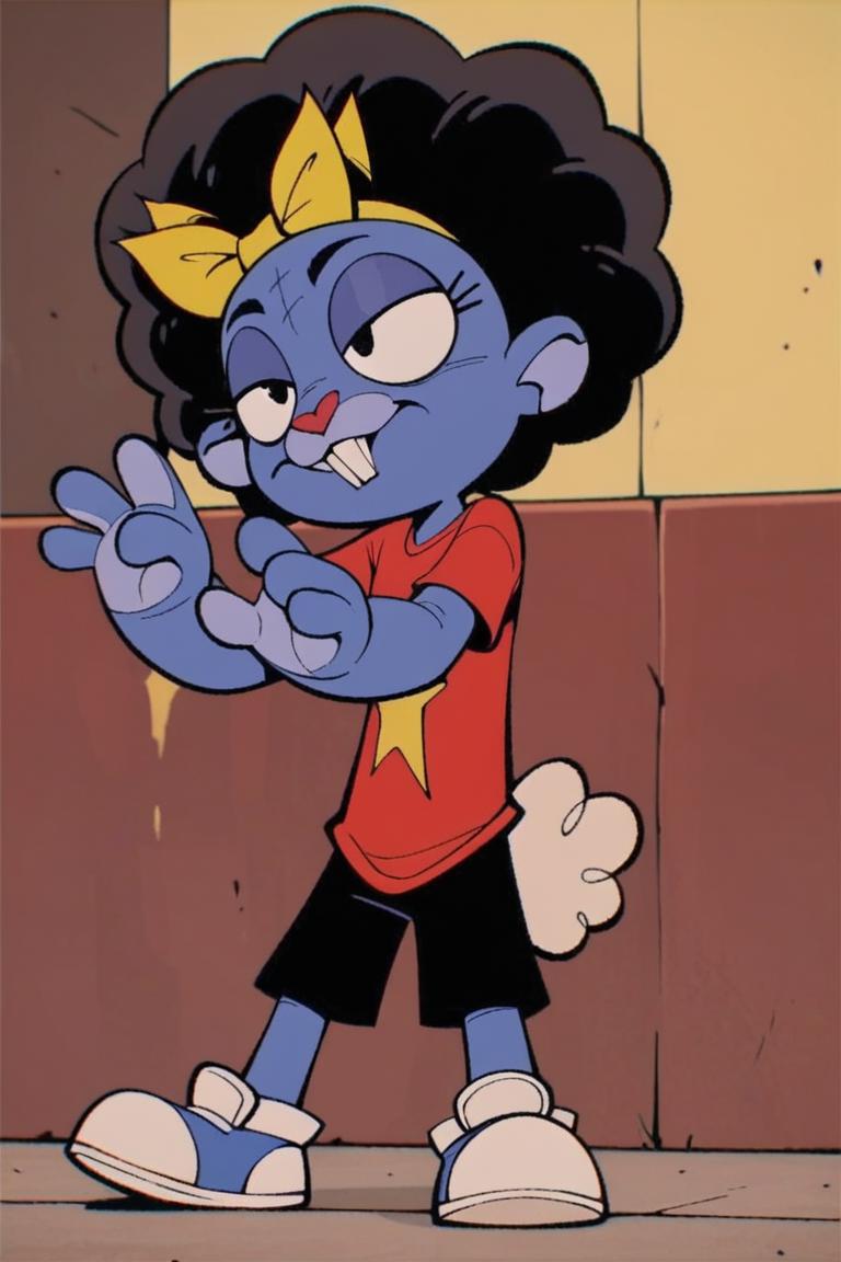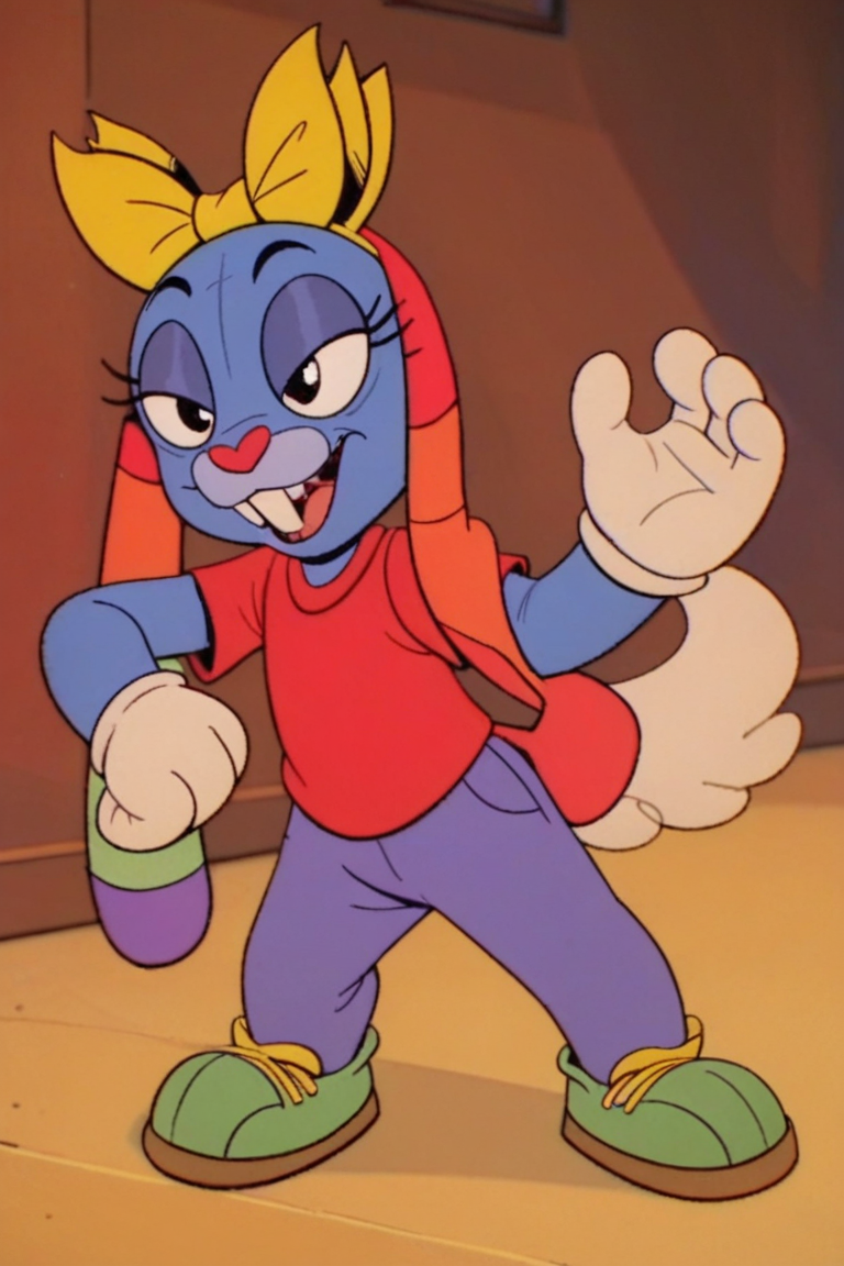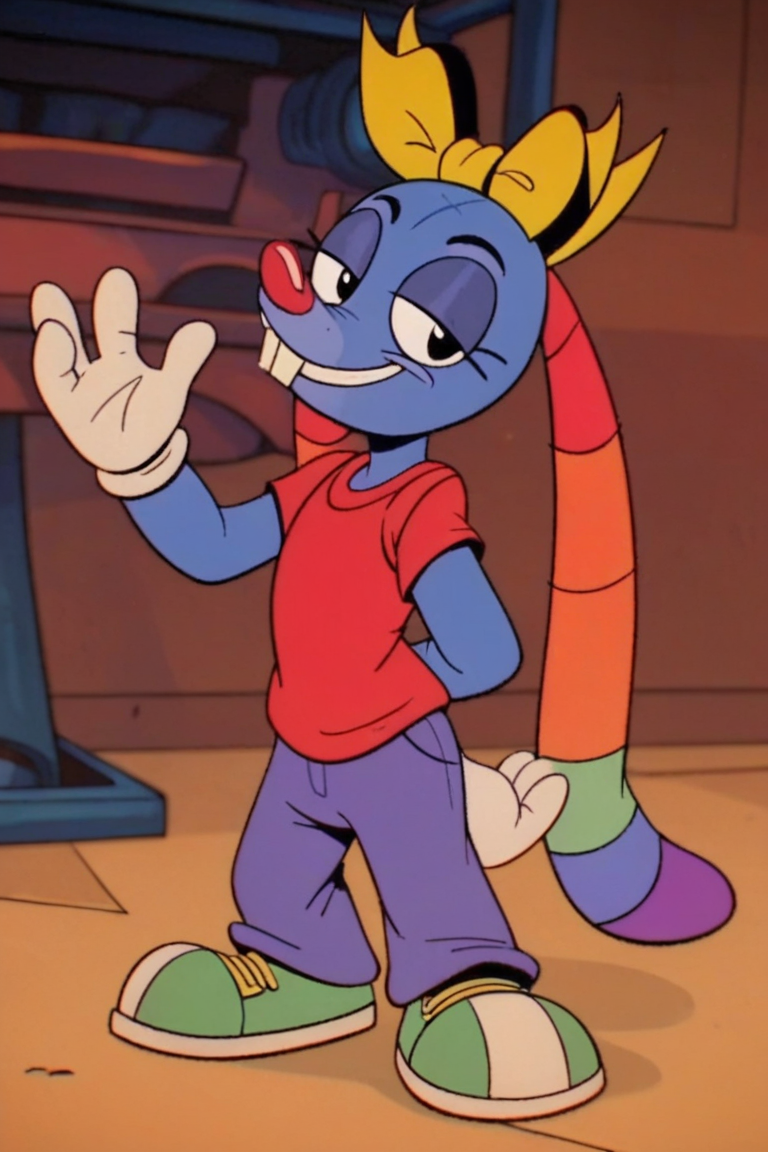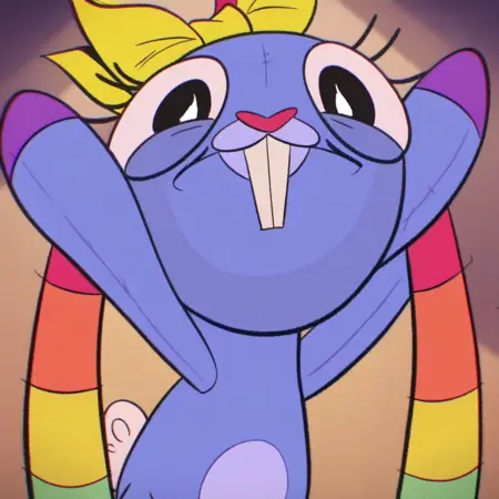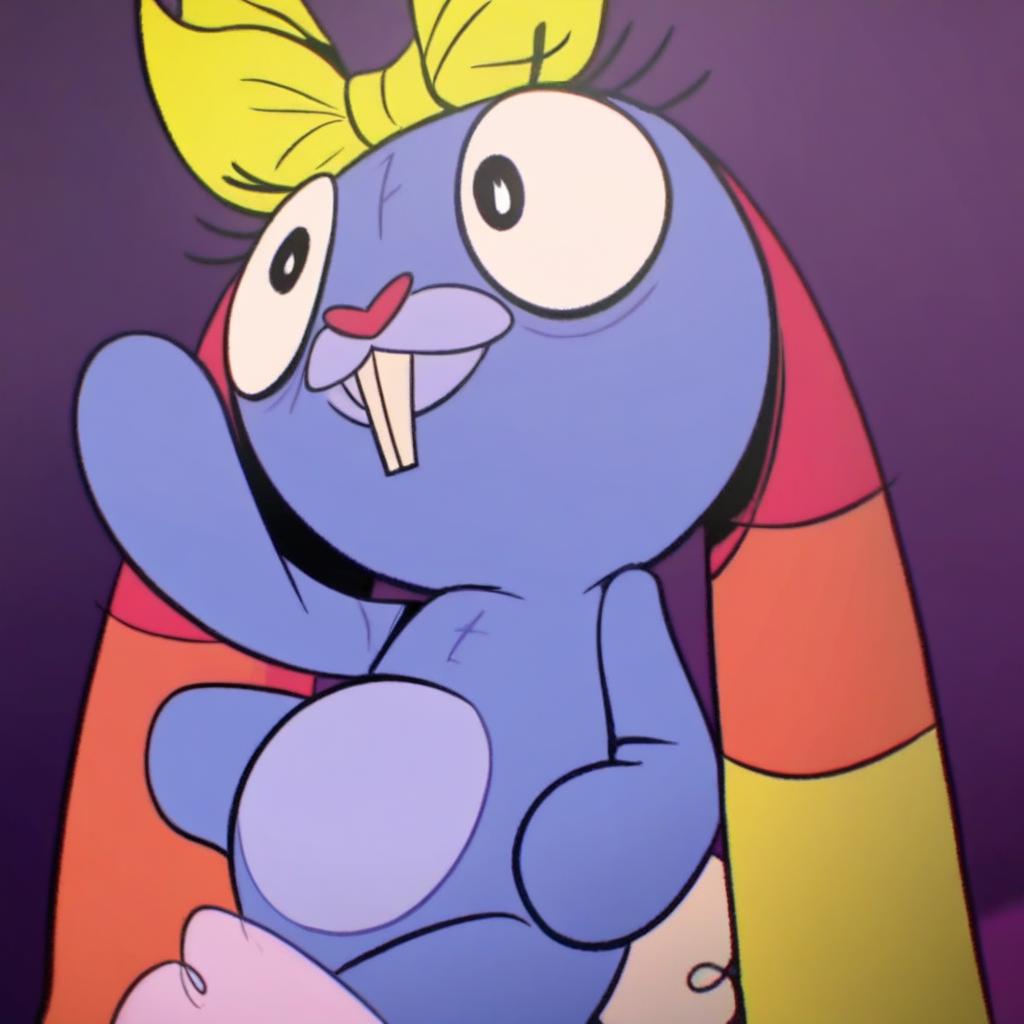 Prompt: Mrs Cuddles, 토끼, 빨간 코, 두드러진 앞니, 길게 늘어진 귀, 무지개 줄무늬 귀, 큰 검은 눈, 흰 꼬리, 짧은 파란 털, 두드러진 속눈썹, 밝은 파란 코, 밝은 파란 배, 진한 파란 바느질 같은 무늬, 노랑 리본