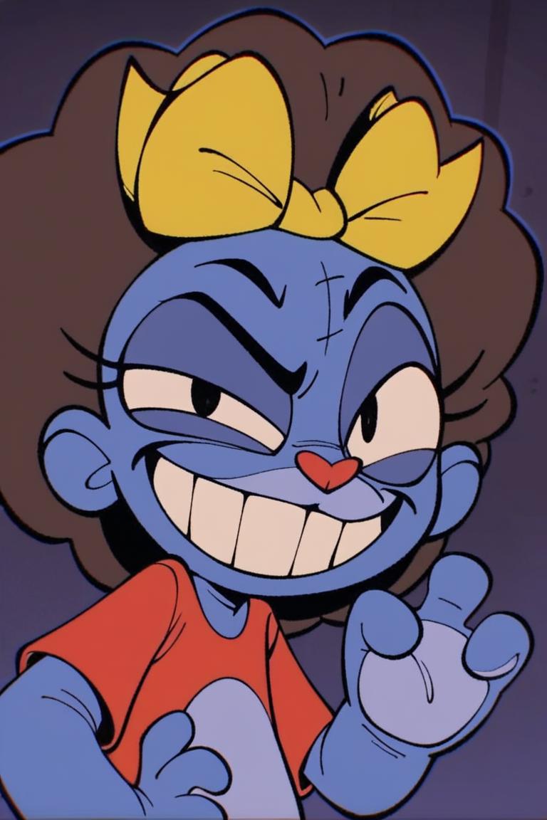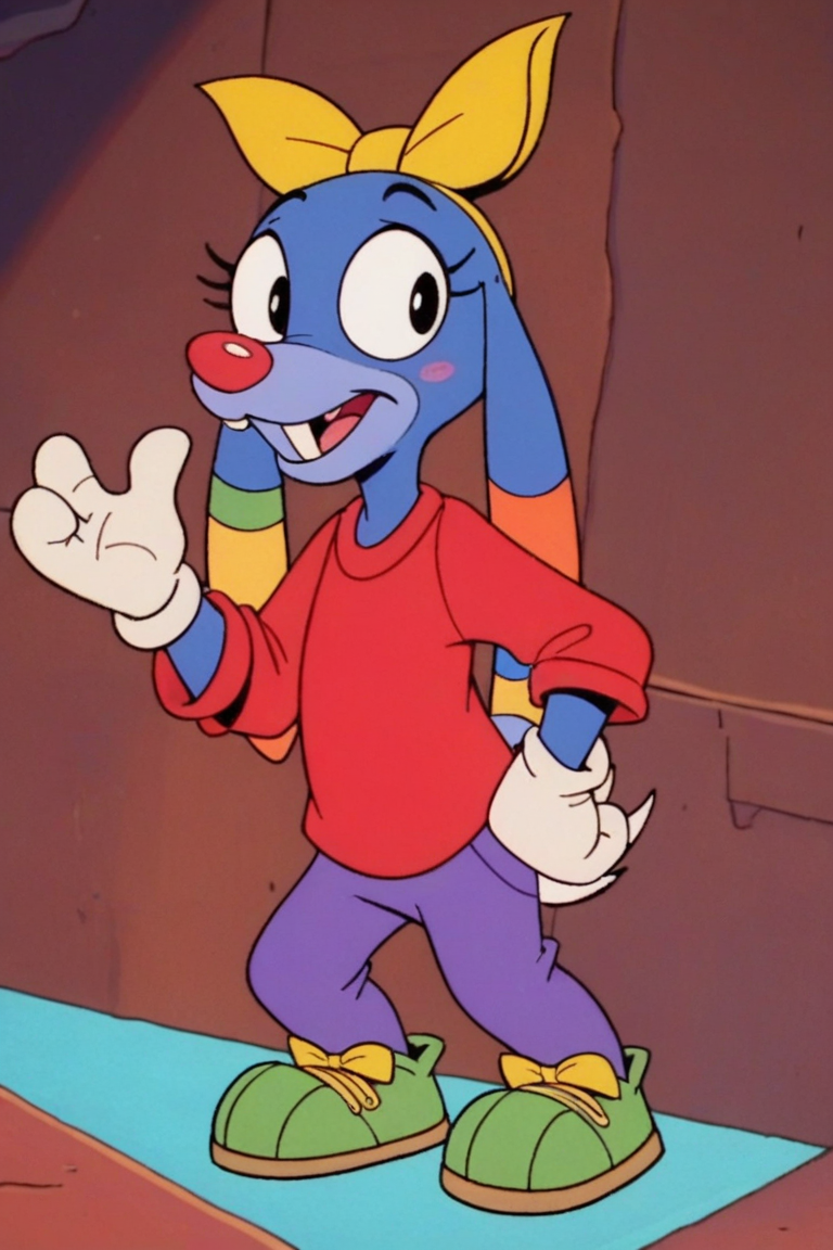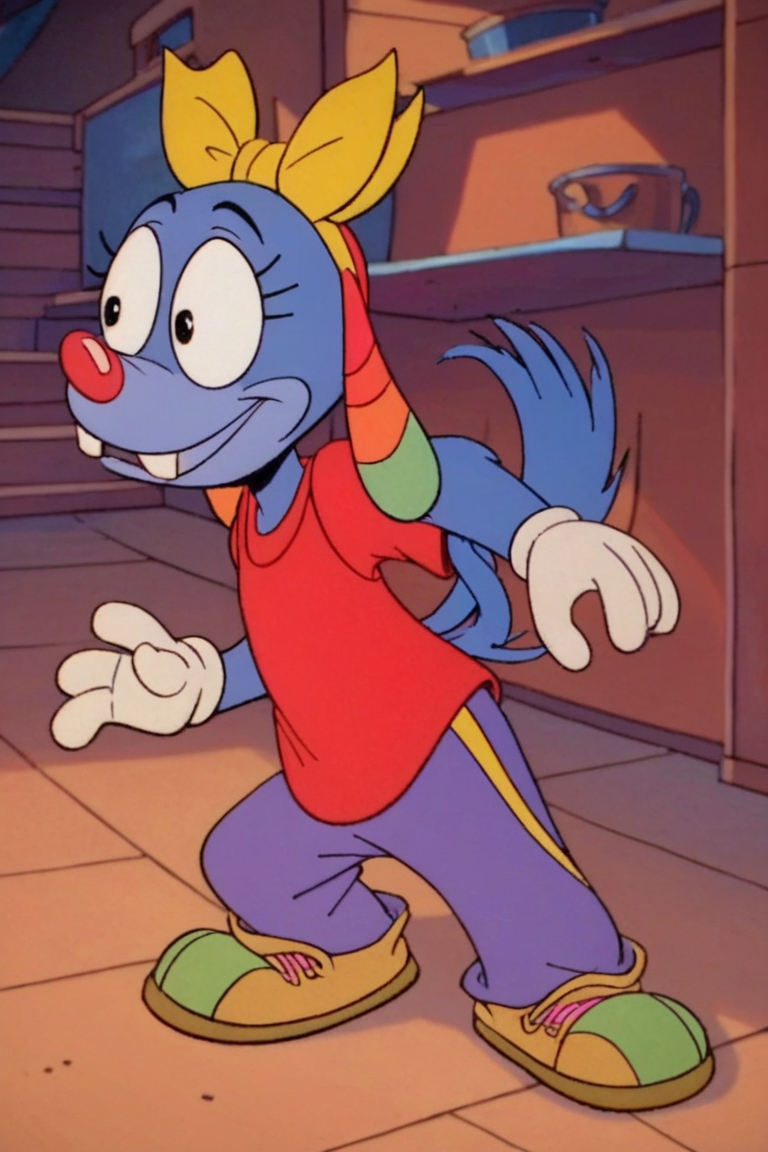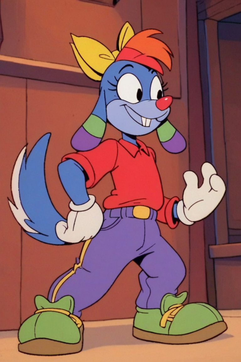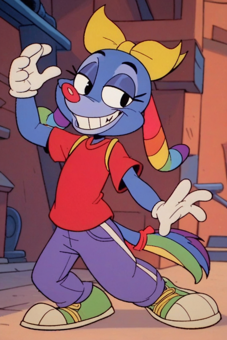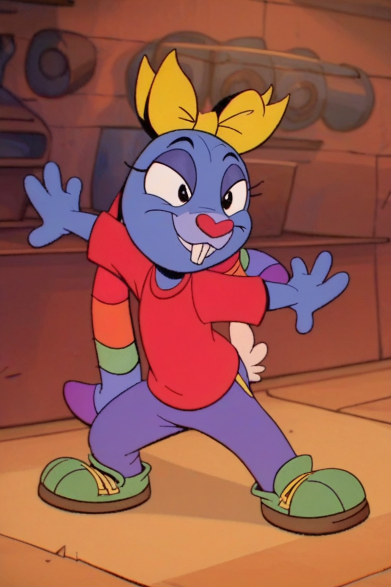 Prompt: Mrs Cuddles, 토끼, 빨간 코, 두드러진 앞니, 길게 늘어진 귀, 무지개 줄무늬 귀, 큰 검은 눈, 흰 꼬리, 짧은 파란 털, 두드러진 속눈썹, 밝은 파란 코, 밝은 파란 배, 진한 파란 바느질 같은 무늬, 노랑 리본