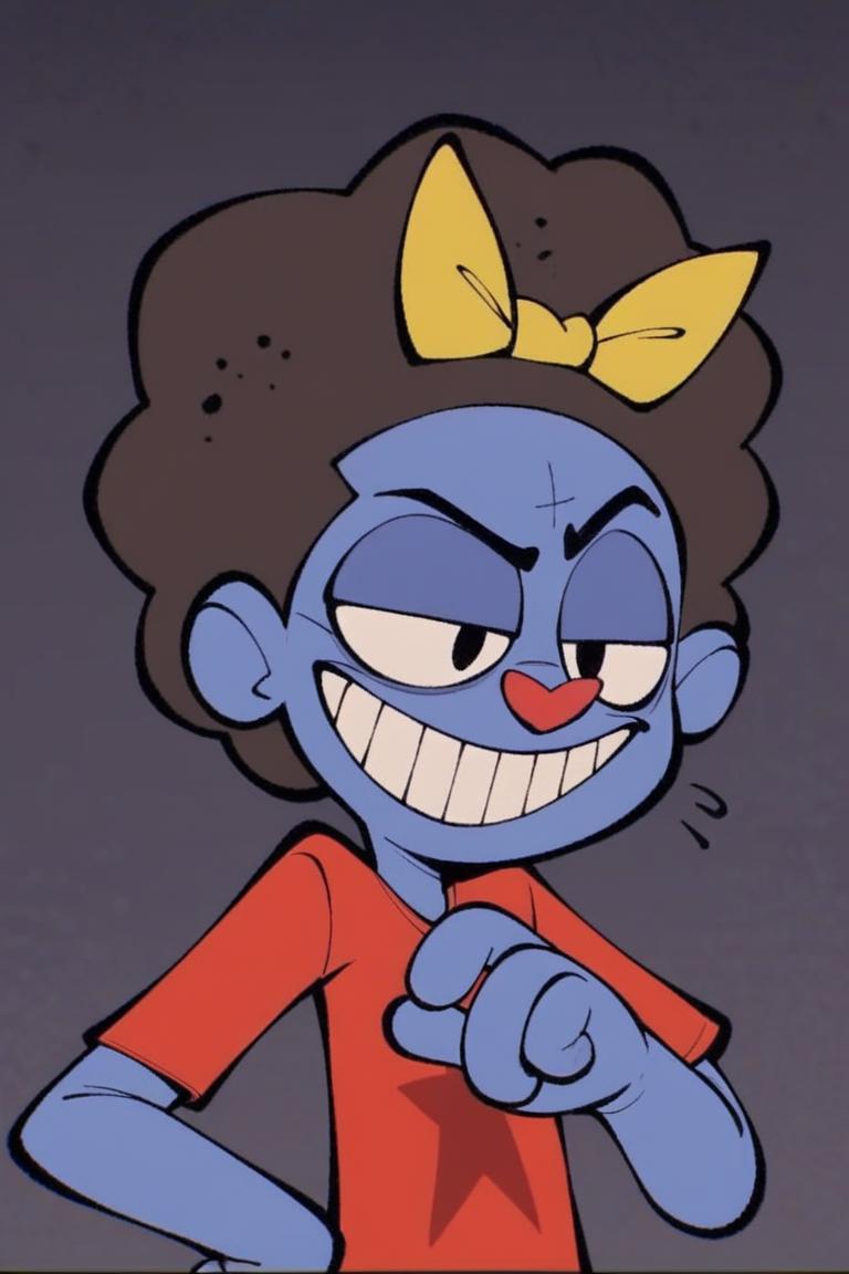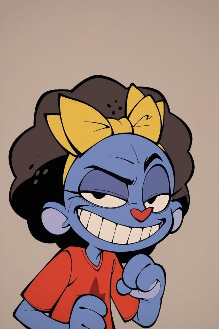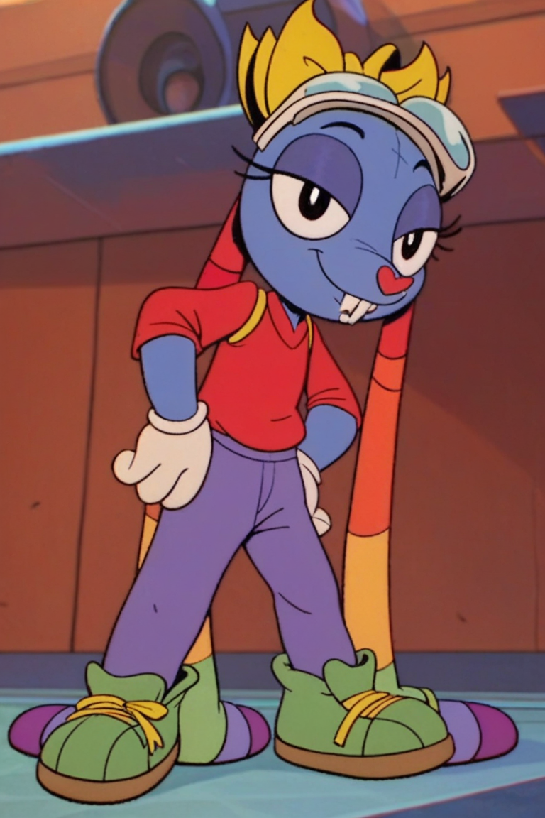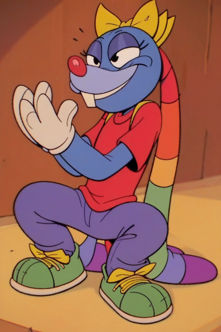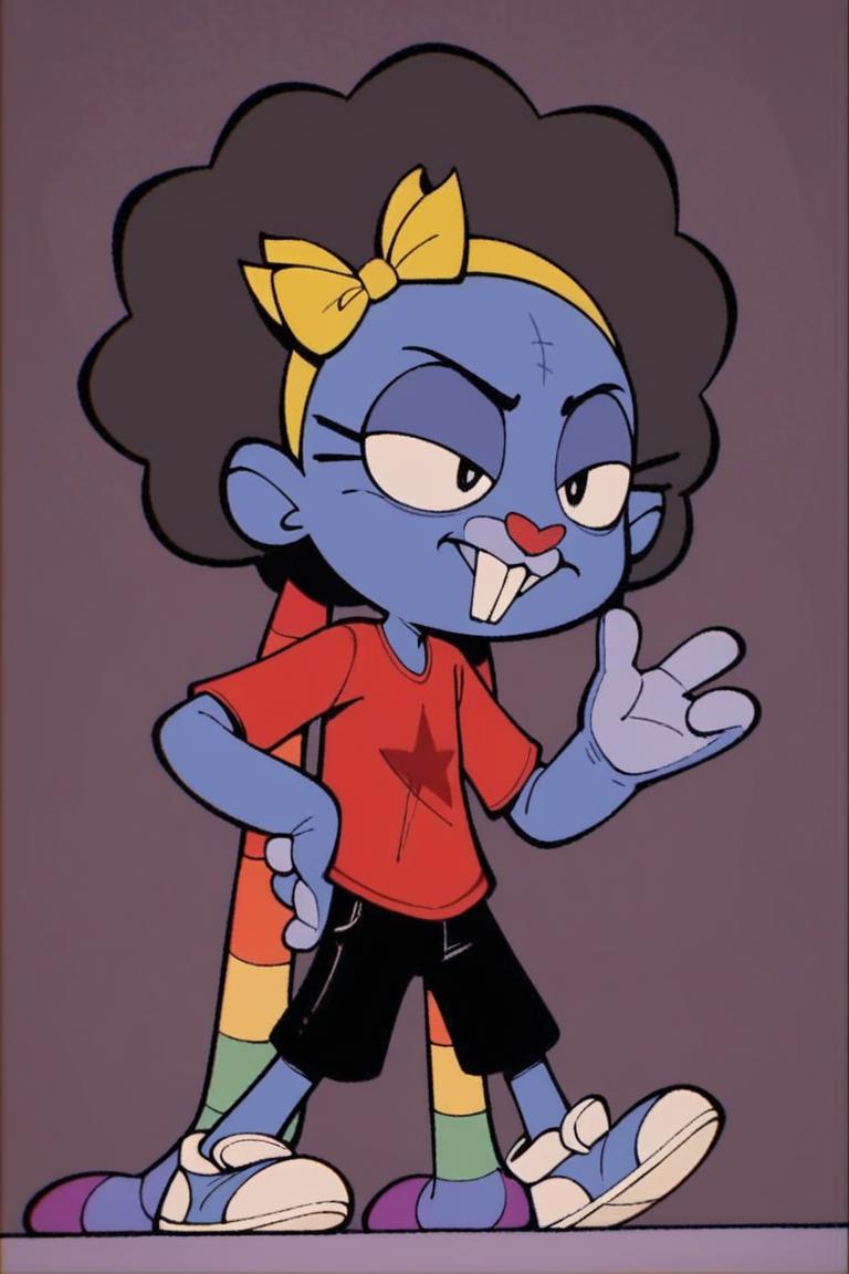 Prompt: Mrs Cuddles, 토끼, 빨간 코, 두드러진 앞니, 길게 늘어진 귀, 무지개 줄무늬 귀, 큰 검은 눈, 흰 꼬리, 짧은 파란 털, 두드러진 속눈썹, 밝은 파란 코, 밝은 파란 배, 진한 파란 바느질 같은 무늬, 노랑 리본