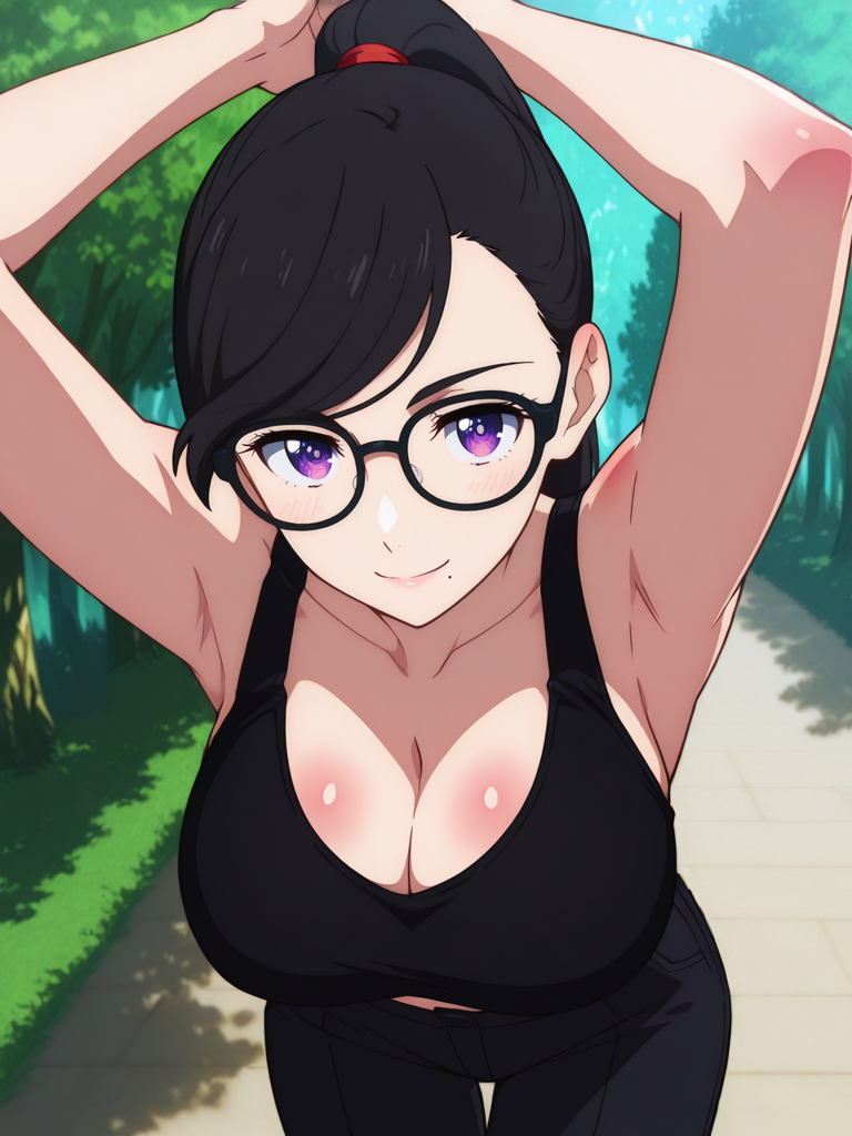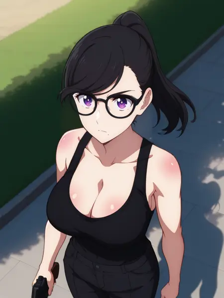hizuru,black hair,swept bangs, purple eyes, black glasses, mole under mouth,