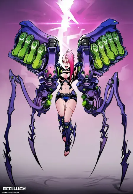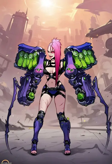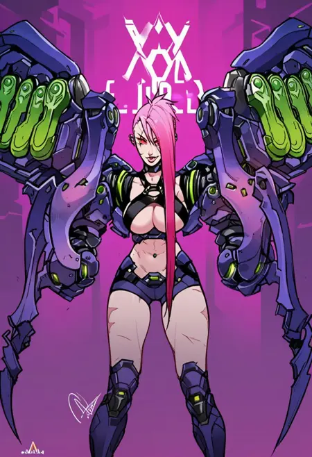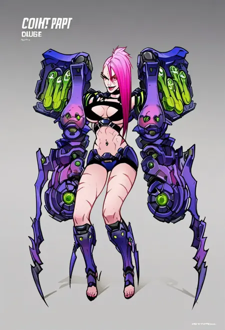 RecluseOverwatch, 1girl, solo, ピンクの髪, 長い髪, 大きな胸, 片目を覆う髪, 胸元, へそ, 腹部, サイボーグ, モンスター娘, 傷跡, 赤い目, 追加の腕, 機械の腕, ピアス, メイク, モヒカン, 非対称な髪型, メカ娘, 节足動物娘, クモ娘, ショートパンツ, アンダーブレスト, 衣服の切り欠き, 巨大な腕,