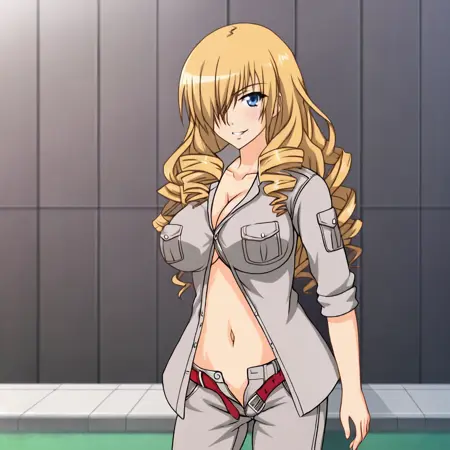 정장 버전 트리거: OrianaSuit, 1girl, 금발 머리, 드릴 헤어, 파란 눈, 큰 가슴, 긴 머리, 배꼽, 벌어진 옷, 젖가슴 노출, 바지, 한쪽 눈을 가린 머리, 버튼 풀림, 팬티 없음, 카우보이 샷
