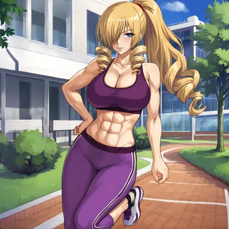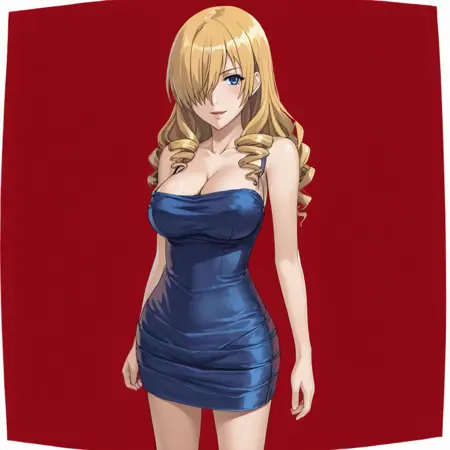 트리거: Oriana, 1girl, 큰 가슴, 금발 머리, 젖가슴 노출, 긴 머리, 드릴 헤어, 배꼽, 한쪽 눈을 가린 머리, 스트랩리스, 파란 눈, 복부 노출, 뱅데오, 카우보이 샷