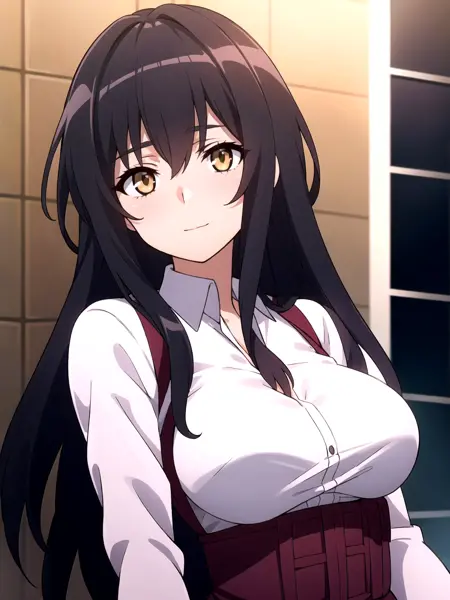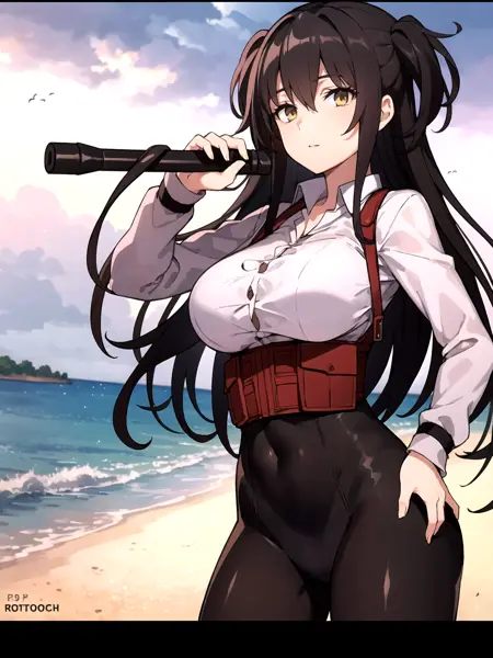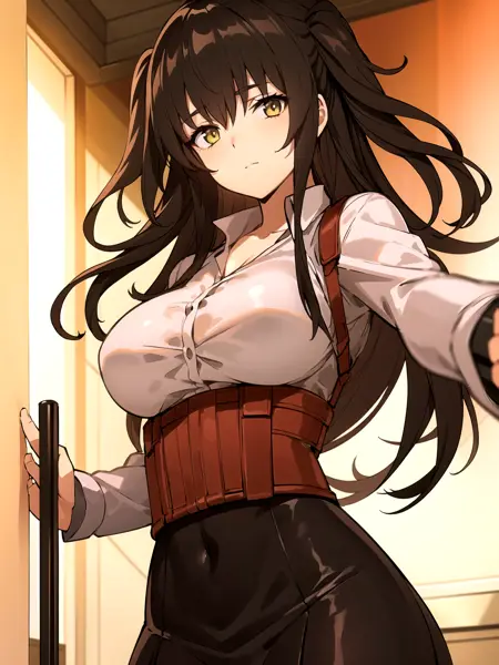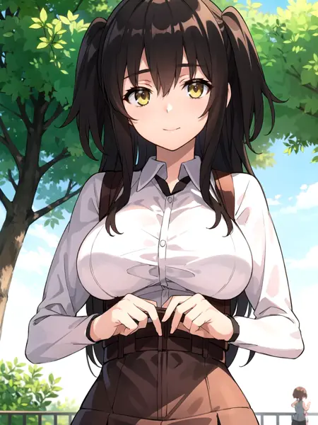 black skirt, two side up, black pantyhose, brown footwear, yellow eyes, white shirt, pantyhose, pouch, holster, rakko yumiya,