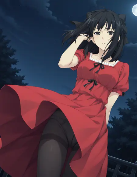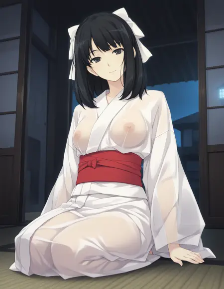 nanatsuki venio, black hair, medium hair, white hair ribbon, black eyes