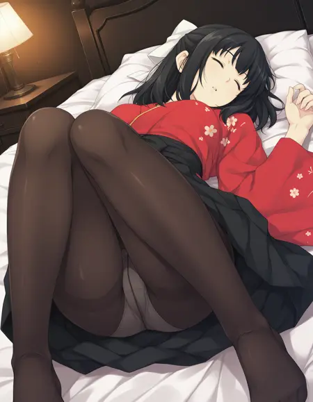 red kimono, floral print, hakama skirt, black skirt, long skirt
