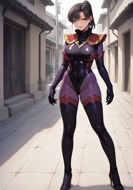 corruption_outfit, purple skin-tight, leotard(black-and-red), red shoulder pad, black elbow gloves with yellow edge, black thigh boots with yellow edge,