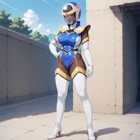 henshin_outfit, white elbow gloves, white shoulder pad, belt, multicolored leotard, black bodystoking, white thigh boots, high heel boots, helmet