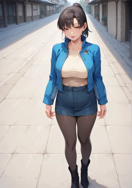 blue jacket, brooch, shirt, denim skirt, pantyhose, high heels boots,