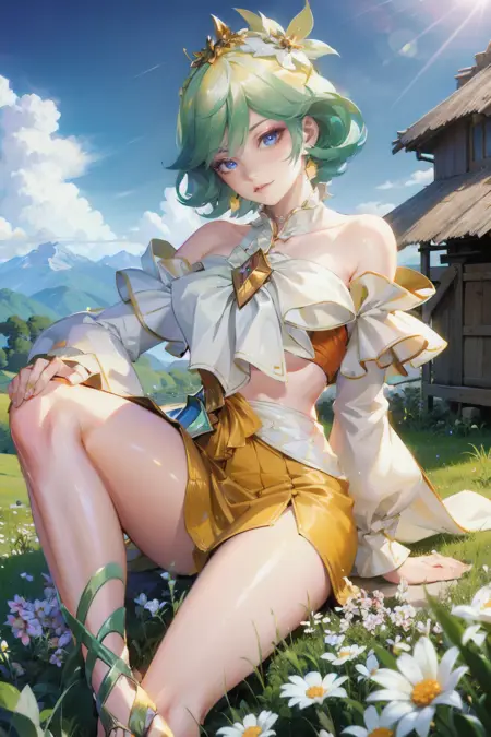프롬프트:, Violet_PoR, 1girl, solo, short hair, green hair, multicolored hair, flower, earrings, looking at viewer, blue eyes, lips, dress, breasts, jewelry, puffy sleeves, long sleeves, nail polish, legs, feet, high heels, white footwear, toes, toeless footwear