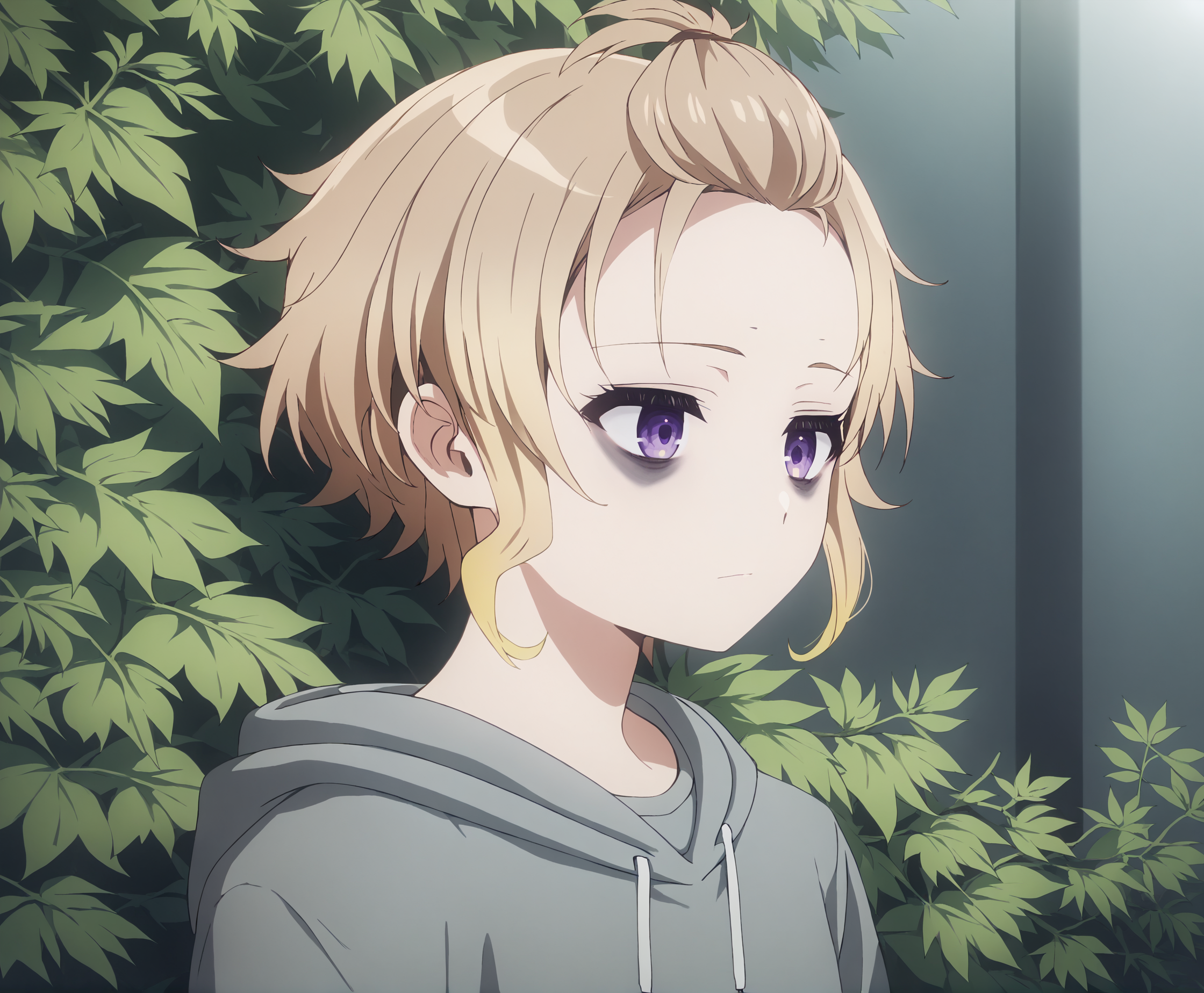 短发、衬衫、金发、紫色眼睛、多色头发、渐变发色、额头、刘海向后别起、棕发、侧发、眼下有眼袋