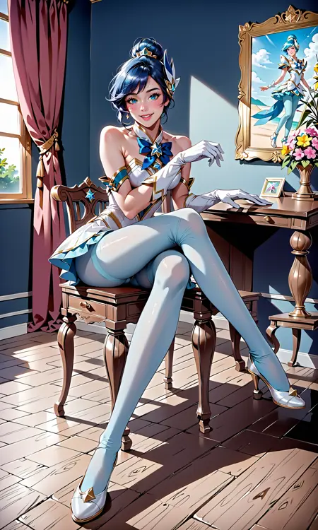 score_9, score_8_up, score_7_up, (solo, 1girl), absurdres, highres, official wallpaper), masterpiece, best quality, illustration, realistic, (perfect details, highest detailed, extreme detailed), lora:SGOriSDXL:1, star guardian orianna, ((light blue pantyhose), elbow gloves, hair ornament, star guardian (league of legends), neck ribbon, star symbol, blue hair, dress, skirt, on stomach, looking at viewer