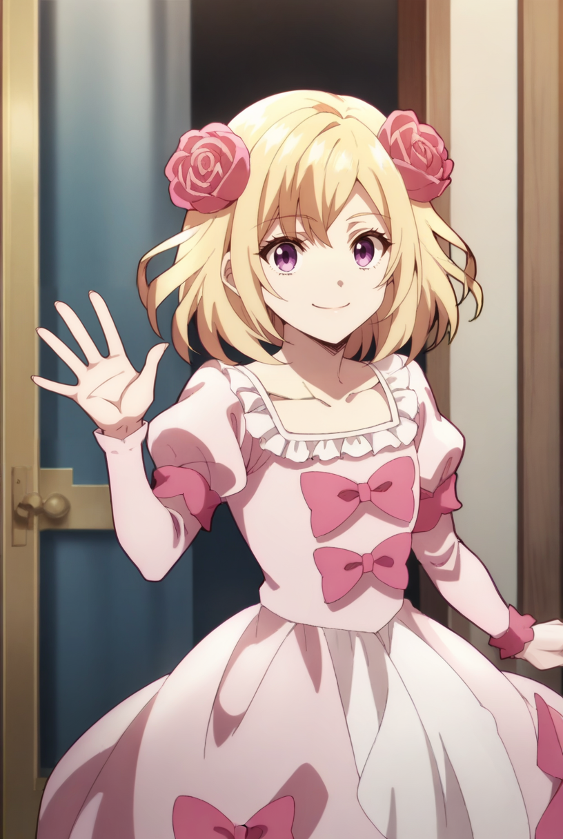 hair flower,pink flower,pink bow,pink dress,puffy sleeves,pink footwear,mary jane shoes