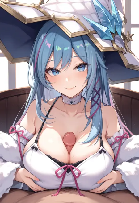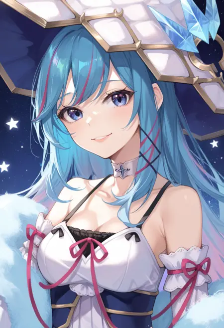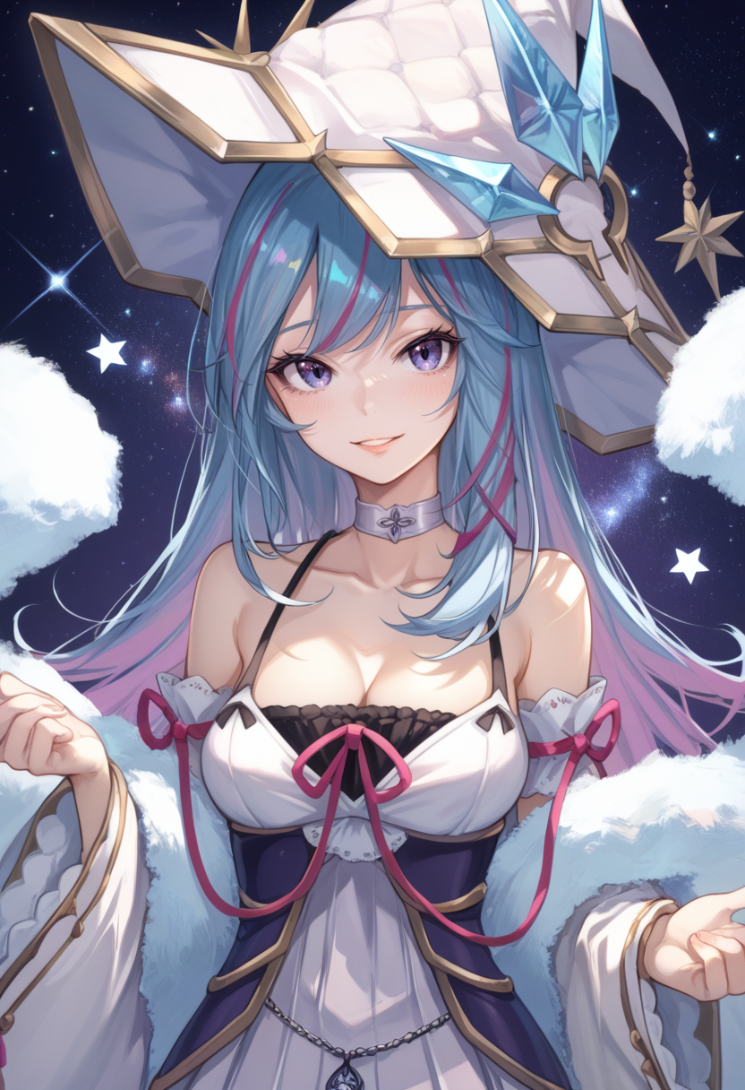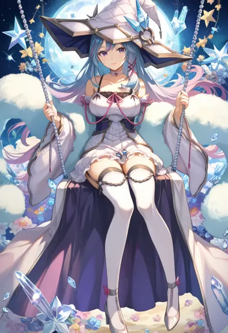 태그(옷): 크리스탈 하이힐, 흰색 허벅지양말, 흰색 칼라, 흰색 분리형 소매, 흰색 민소매 드레스, 흰색 마녀 모자, 보라/검정 머리 장식, 모피 트림 보아, 보라/검정 코르셋