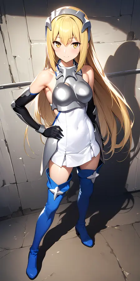 AnimagineXL 激活标签为:“ais_wallenstein, 1girl, solo, blonde hair, long hair, yellow eyes, medium breasts, armor, breastplate, dress, blue thigh boots”,并建议使用 “anime coloring” 标签。