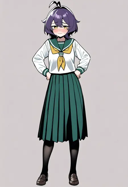 여학생 복장 프롬프트: hiiragiutena, 1girl, 진보라색 머리, 안테나 머리, 앞머리, 단발, 갈색 눈, 뺨에 홍조, 닫힌 입, 흰 셔츠, 녹색 해군 칼라, 녹색 주름 긴 치마, 로퍼, 긴 소매, 검은 팬티후스, 노란 넥커치프, 학교Uniform, serafuku