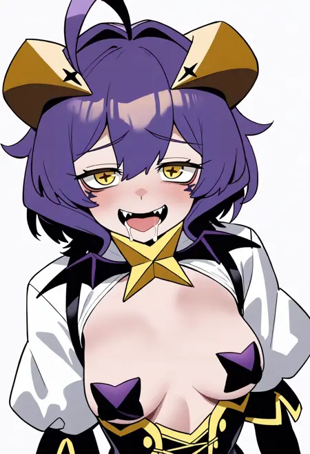 Magia Baiser 복장 프롬프트: magiabaiser, 1girl, 보라색 머리, 단발, ahoge, 노란 눈, 검은 별 모양 동공, 코르셋, 패스티, 중간 크기 가슴, 풍성한 소매, 브라이덜 장갑, 로우레그 바지, 데몬 소녀, 데몬 뿔, 데몬 날개, 배꼽, 흰색 쇼걸 치마