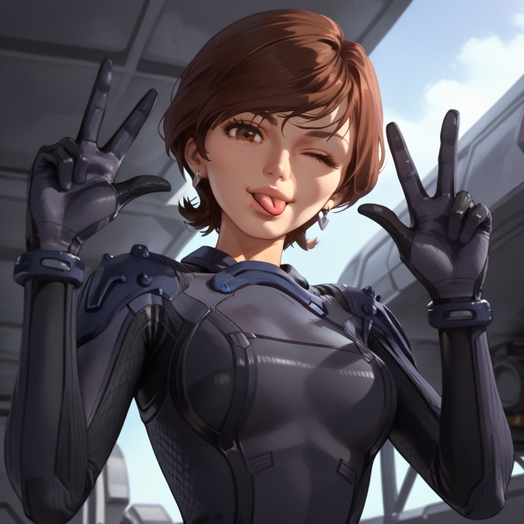 margaret_fb, short hair, brown hair, brown eyes, earrings, bodysuit