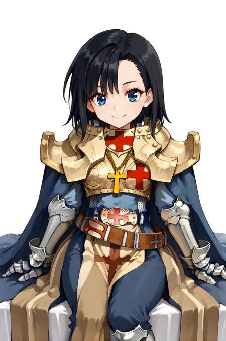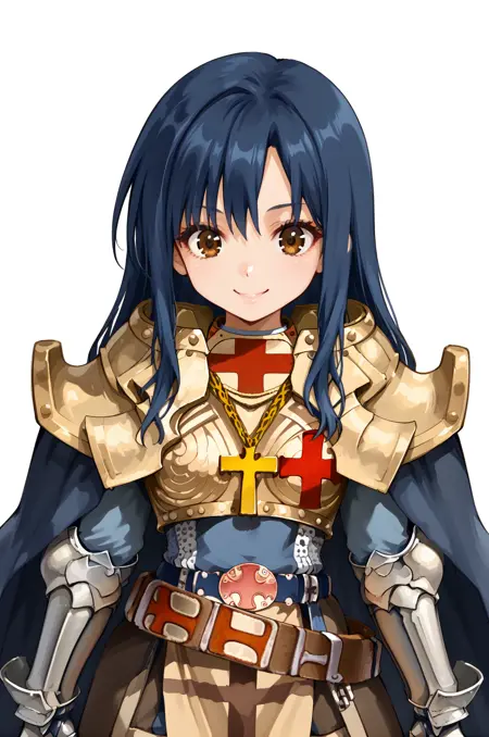 prompt: crusRO, armored dress, gauntlets, belt, cross, pauldrons, long cape, blue cape, tabard, cross necklace, gorget, brown pelvic curtain, blue pantyhose, greaves