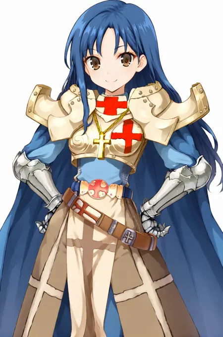 프롬프트: crusRO, 갑옷 드레스, 장갑, 벨트, 십자가, 어깨 보호대, 정강이 보호대, 긴 망토, 파란 망토, 타바드, 십자가 목걸이, 목 보호대, 갈색 골반 커튼