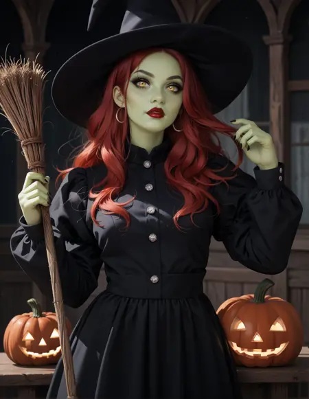 1소녀, 혼자, 긴 COLOR 머리, 녹색 피부, 노랑색 눈, 립스틱, 아이라인, hud_tr4d_w1tch, 마녀 모자, 검은 드레스, 긴 소매, 단추