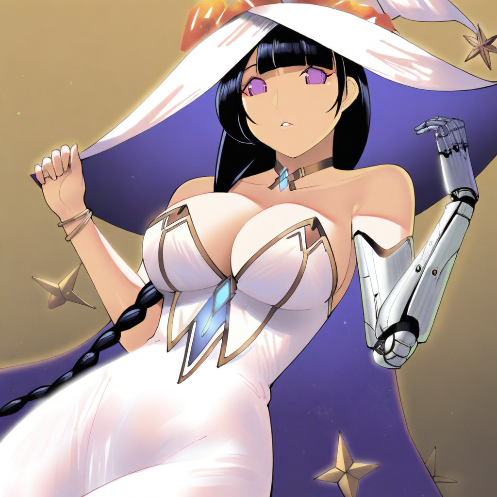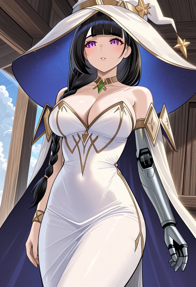 mlddefault, witch hat, cleavage, white dress, dress, bare shoulders, witch, strapless, long dress, white headwear, single mechanical arm, bracelet, jewelry, collarbone,