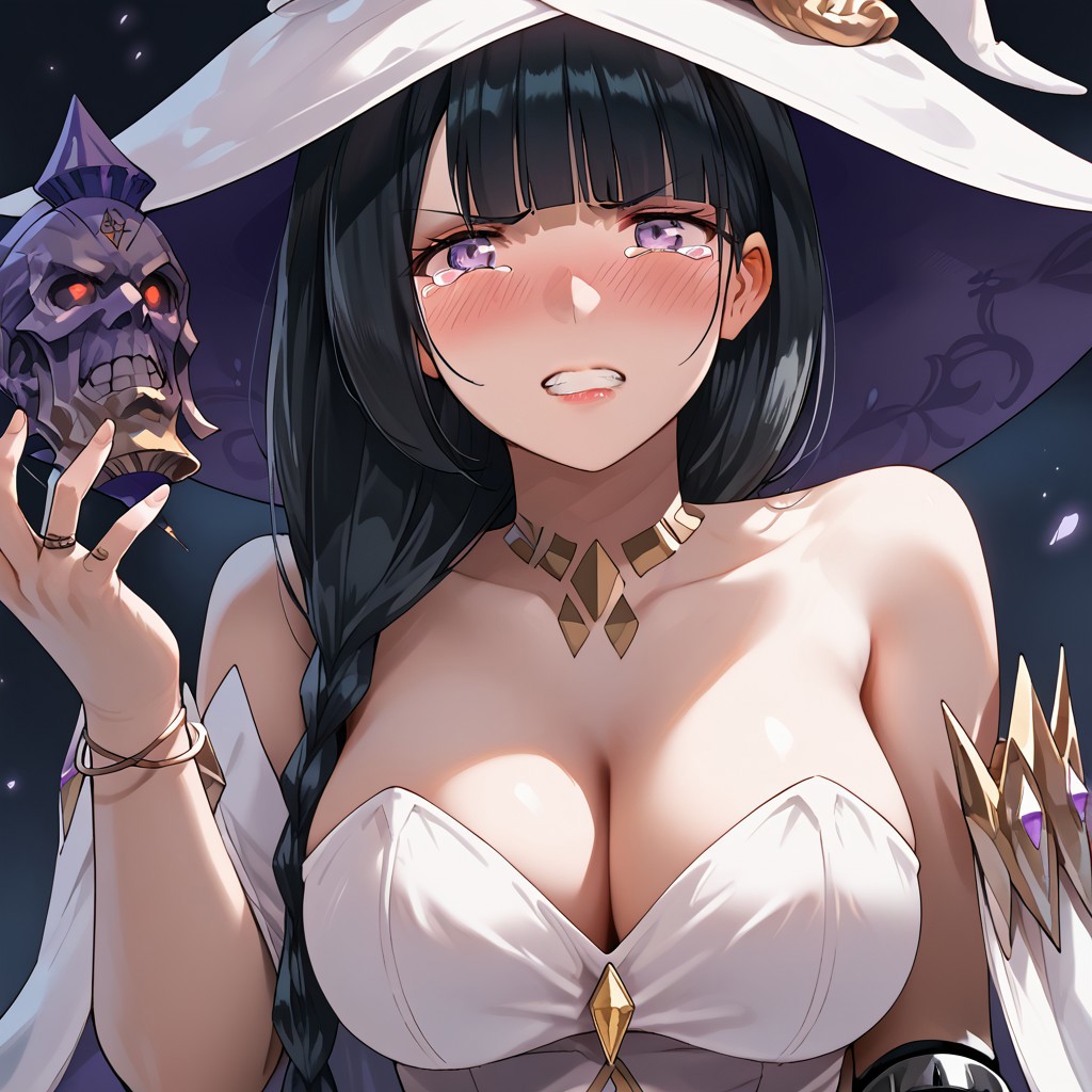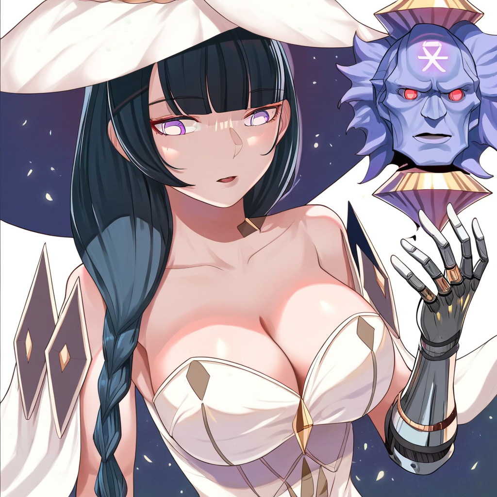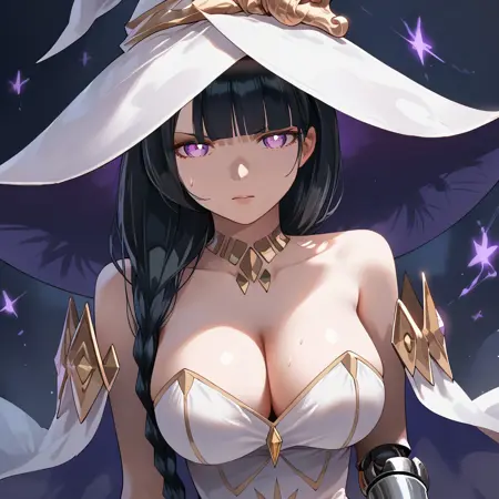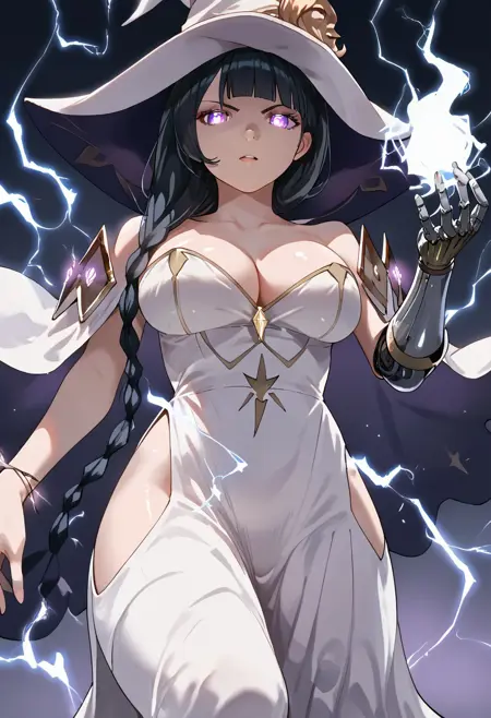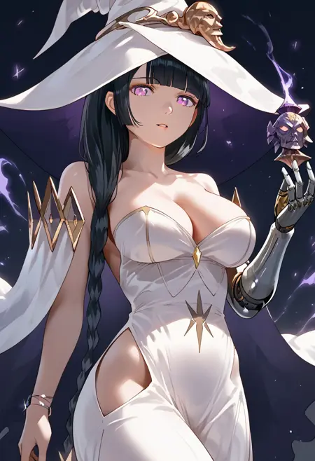 mlddefault, witch hat, cleavage, white dress, dress, bare shoulders, witch, strapless, long dress, white headwear, single mechanical arm, bracelet, jewelry, collarbone,