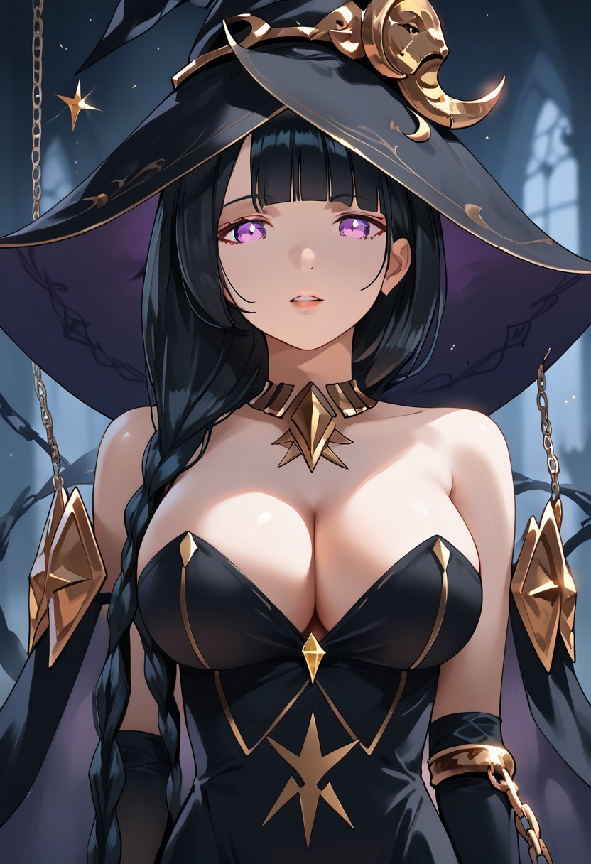 mldblack, witch hat, cleavage, chain, witch, dress, bare shoulders, elbow gloves, black headwear, crescent, strapless,