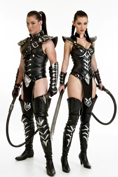 beastmaster, vest, thighhighs or pants, pelvic curtain, dual wielding, holding whip, etc.