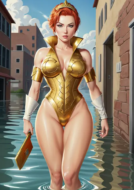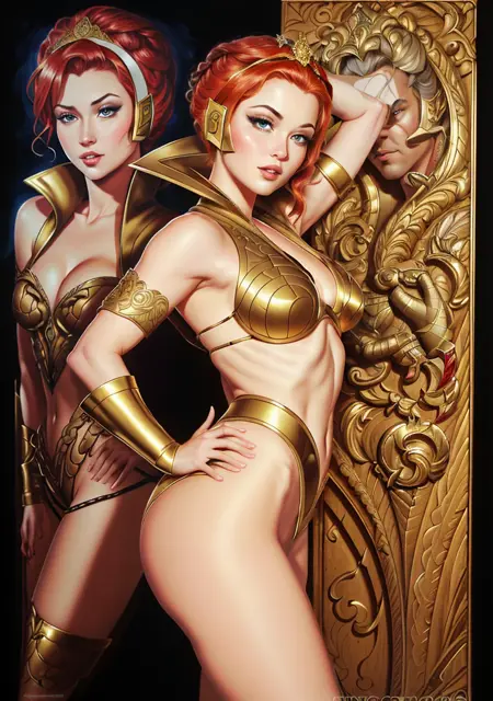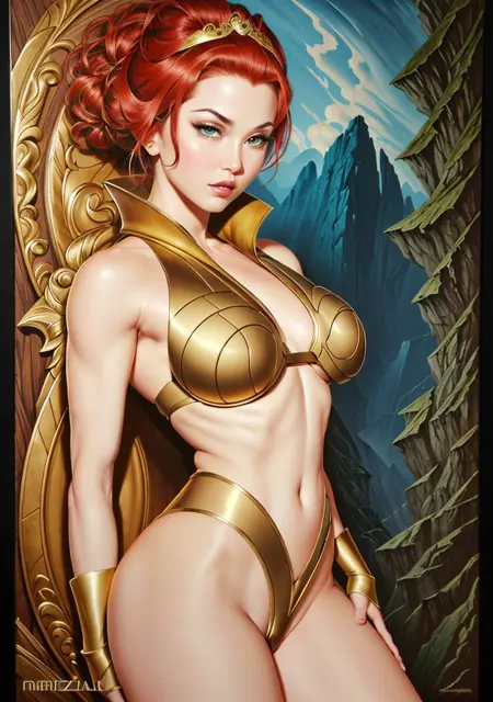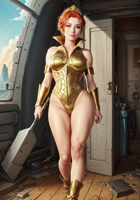 (best quality:1.33), (masterpiece:1.42), (detailed:1.15), (cartoon:1.5), (style of Arthur Adams:1.4), レトロアートスタイル, 強調線, 夜, 感動的なティーラキアロンキャラクターのフォトセッション, (赤髪:1.3), 赤髪, 金色のティアラ, 金色の鎧, 肌肉質な体格, 肌肉質の脚, 腹筋, 前に肩を出すポーズ, キネマティック, (サイドライティング, 細部まで美しい目の描写:1.2), HDR, 大げさな特徴, 世間から忘れ去られた場所, マジックリアリズム, lyco:quiron_Teela_v1:1.0
