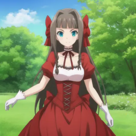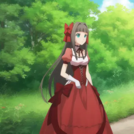 역음성 프롬프트: 빨간 드레스, 장갑, 머리 끈, 리본