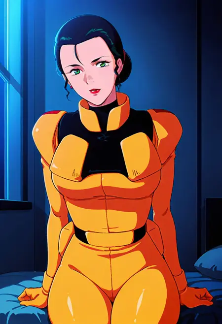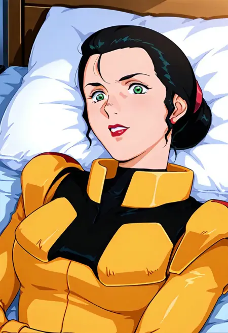 lupe cineau,female,black hair with band,red ear accessory,green eyes,red lips