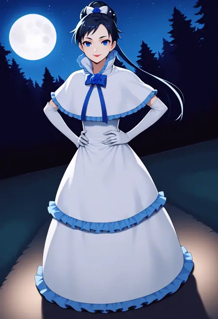 短披肩裙提示词:1girl, divabl, 蓝眼睛, 黑发, 长发, 口红, 发髻, 马尾辫, 头发蝴蝶结, 蓝色花朵, 荷叶边裙子, 白色短披肩, 白色肘套, 荷叶边