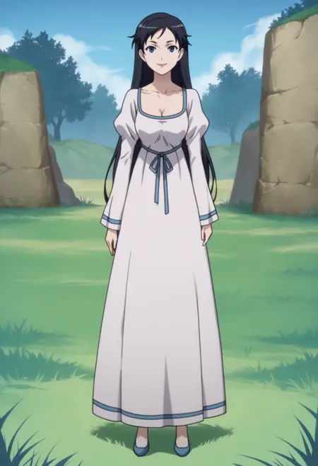 连衣裙提示词:1girl, divabl, 蓝眼睛, 黑发, 长发, 挺胸, 锁骨, 长袖, 蓬松袖子, 连衣裙