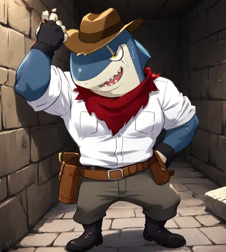 "1ndyj4ws, サメ, 頭のヒレ, サメのヒレ, 尖った歯, 目の傷跡, 二色の体, 青い肌, 黄色い目"