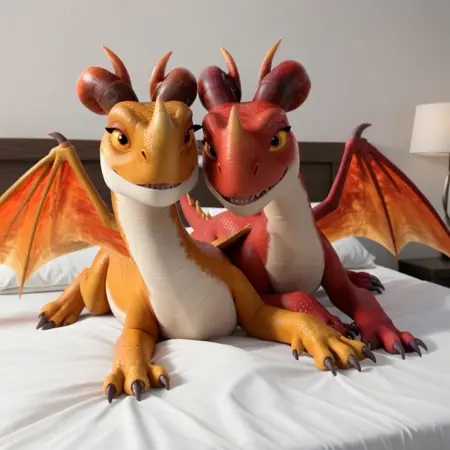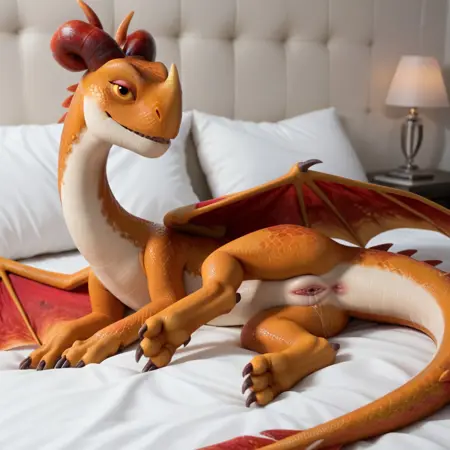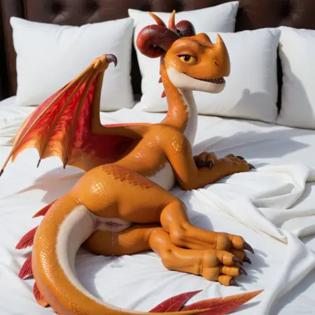 附加提示词:dragon, fire fury, orange scales, horns, red wings, tail, claws, orange eyes, yellow sclera, female, 1girl