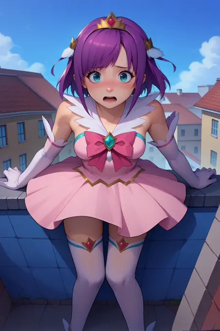 Trigger word is "rikaichi" and "purple hair, cyan eyes, short hair" is required.