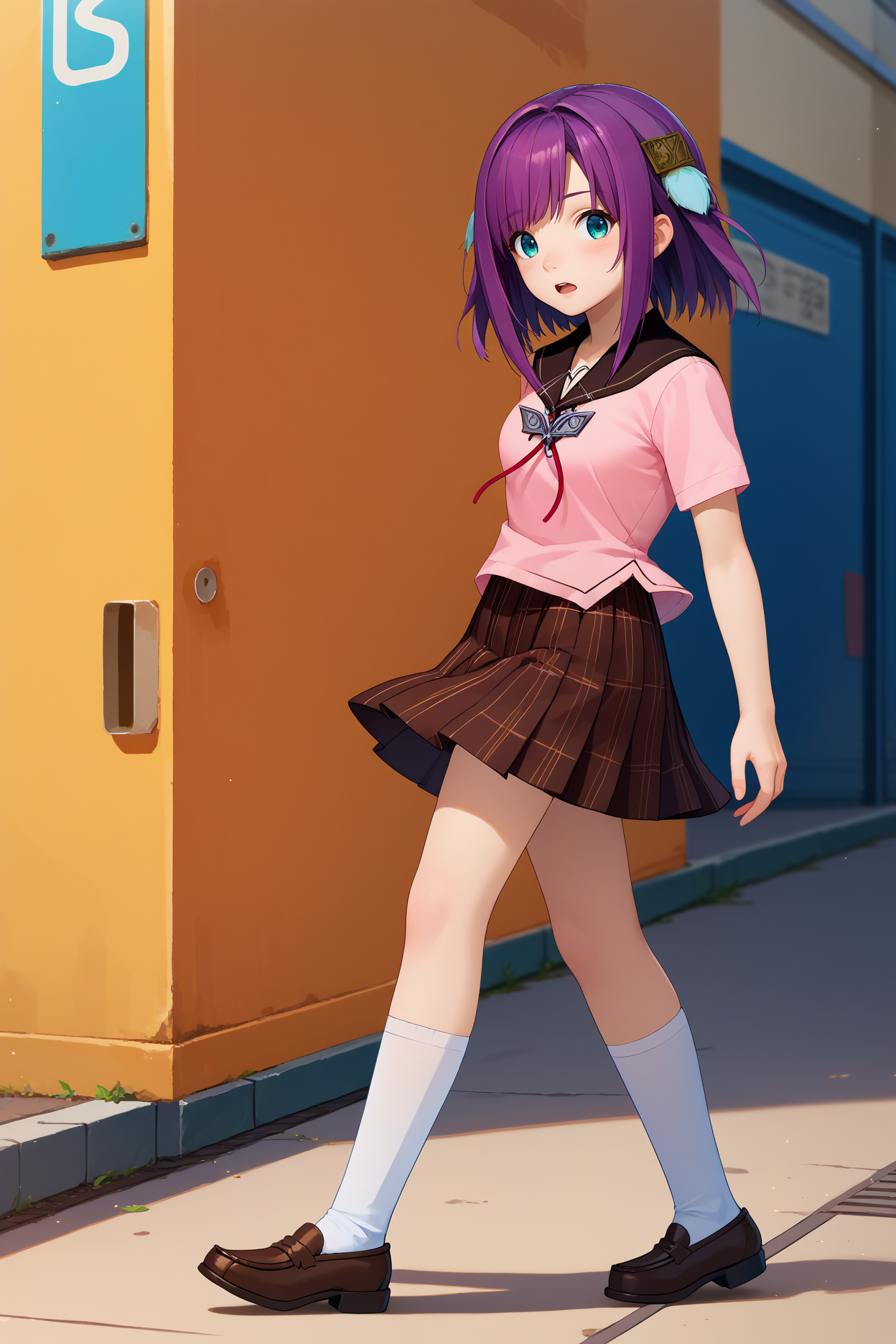 Add "hair ornament, pink shirt, black sailor collar, short sleeves, neck ribbon, plaid skirt, brown skirt" for her uniform.